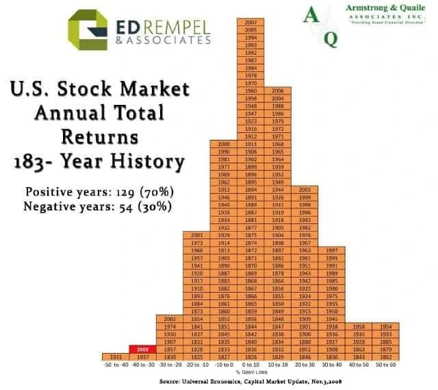 The attached chart with 183 years of market history puts a lot of things into perspective. It shows how many years the market returns were in each percentage range. By the time the year had ended 2008 found its place at the second column from the left at -37%.