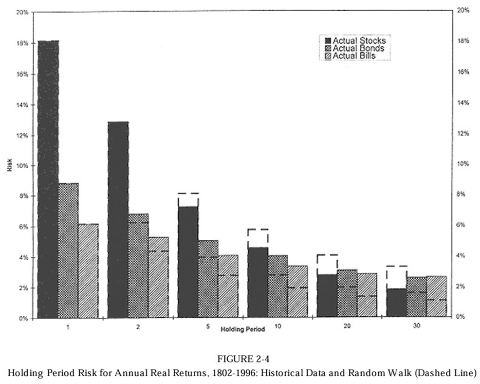 In this chart from his book, the dashed lines are the random walk. Note that stock market risk (unpredictability) declines much faster than random walk claims the longer you are invested. The actual standard deviation after 30 years is barely over half the random walk.
