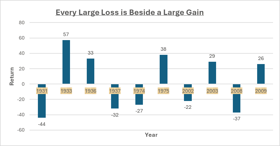 The reasons for this is that stock market big gains tend to be right after big losses.