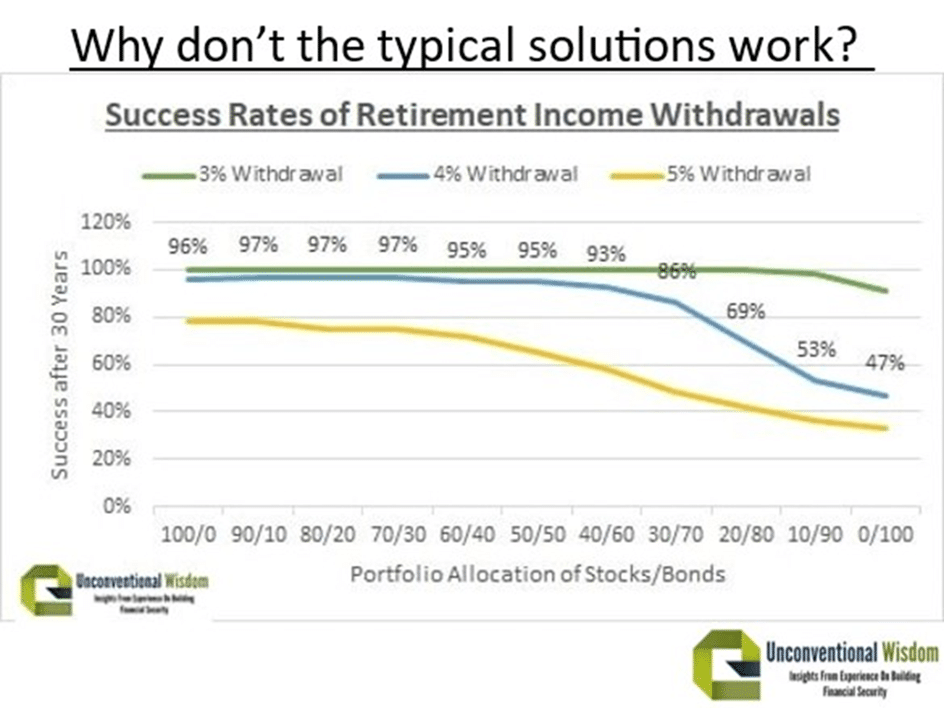 The chart below shows the actual success rates for providing for a 30-year retirement during the last 150 years. Note that generally the higher your allocation to stocks, the more reliable your retirement has been.