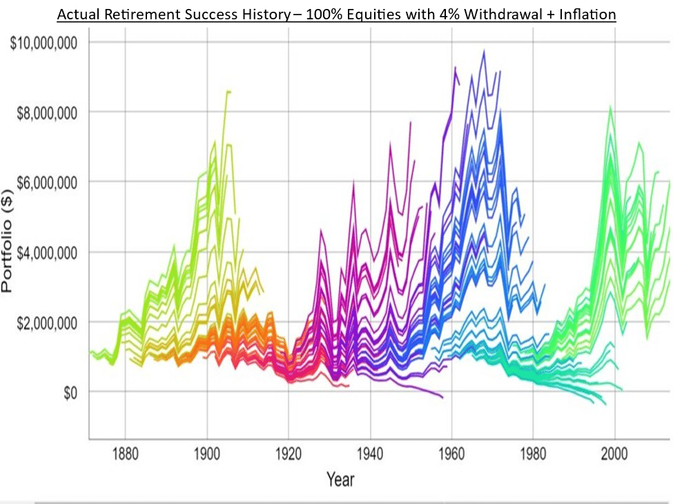 In this graph, every line is a 30-year retirement starting that year, withdrawing 4%/year the first year and increasing your income every year by inflation.